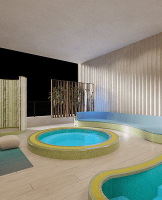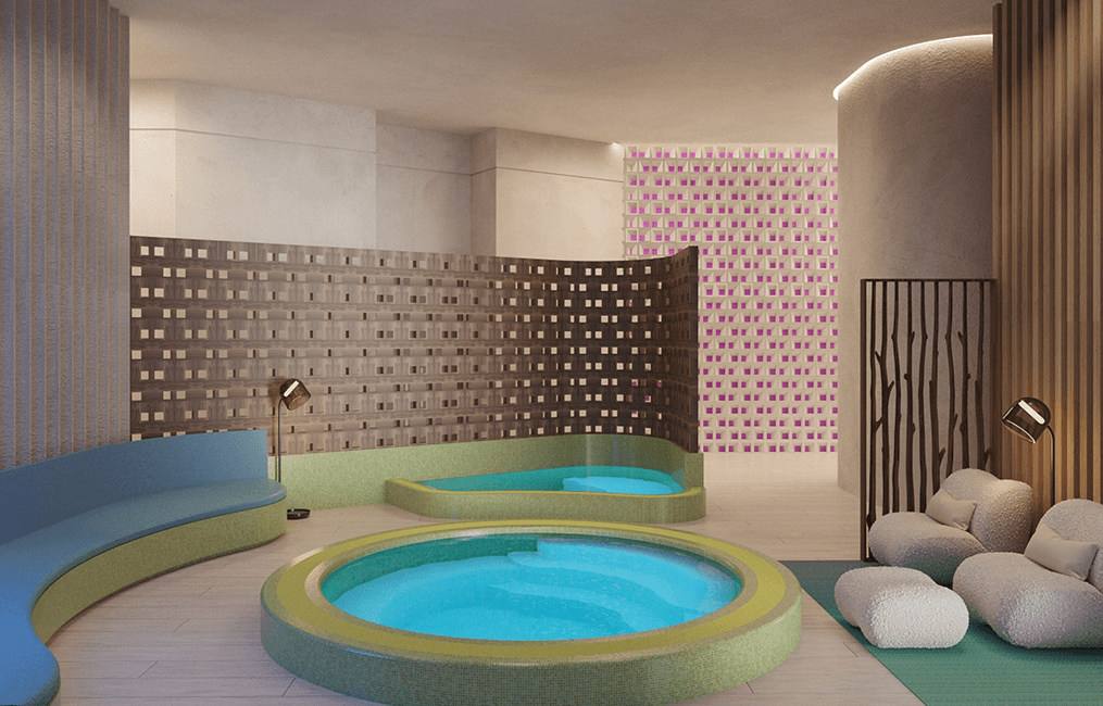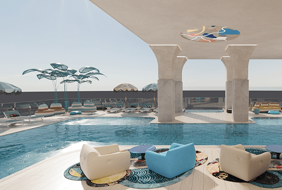 Cloud Nine, the open-air pool deck, is a sun-soaked retreat with a 1,625-square-foot pool. Enjoy private cabanas, a transparent cantilevered jacuzzi overlooking the art plaza below, daybeds, a sundeck, and a poolside gathering area serving fresh juice and snacks.